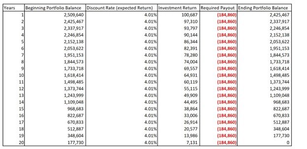 Chief Davis attends a retirement consultation and brings his numbers with him. After 42 years of service, he has earned an abnormally high service pension in the amount of $225,000 per year. Chief Davis will also receive the annual VSF (Variable Supplement Fund) payment of $12,000 per year and expects to pay an average tax rate of 22% in retirement. His wife Susan is several years younger than he is, and they expect to collect the pension for 20 years. Current market rates indicate an appropriate discount rate of 4.01% to value this pension. The Chief is surprised when the retirement advisor tells him that the value of his pension is estimated to be about $2.5M. However, the advisor reminds him that it took 42 years of service to build that pension value. The key details of the pension valuation follow:
